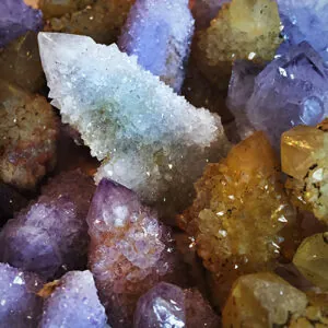 Spirit Quartz, also known as Cactus Quartz or Fairy Quartz, is a variety of quartz which displays an unusual growing habit – a central candle-shaped crystal form with a faceted termination, and the main body covered with small points. It is a rare crystal that is found only in the Magaliesberg Mountain region of South Africa. Spirit Quartz has a unique composition, containing both amethyst and citrine, giving it a violet and yellow coloration. It also contains iron and aluminum, which contribute to its distinct metallic sheen.